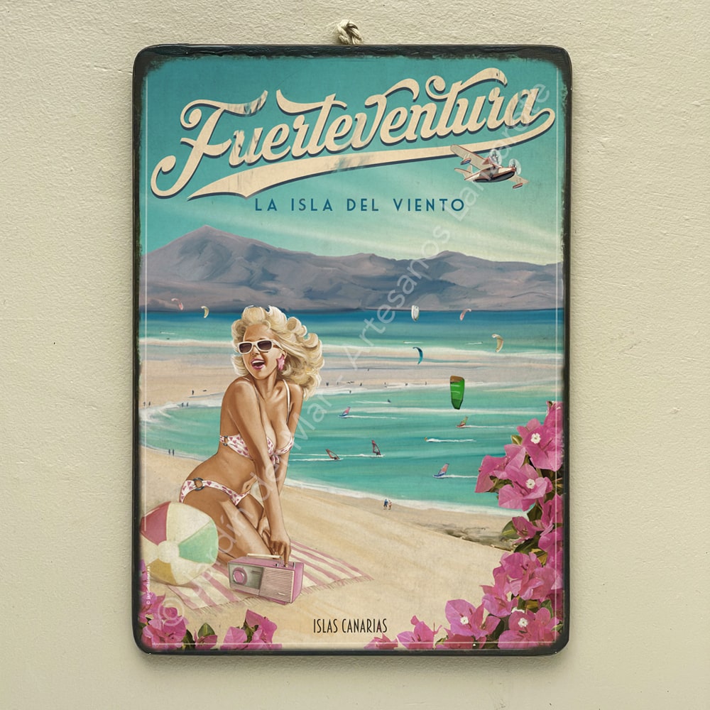 This hand-crafted wooden plaque, with a vintage-style illustration by Mad Mac, captures the free and sunny soul of this unique island. The pin-up girl in the foreground confirms this!