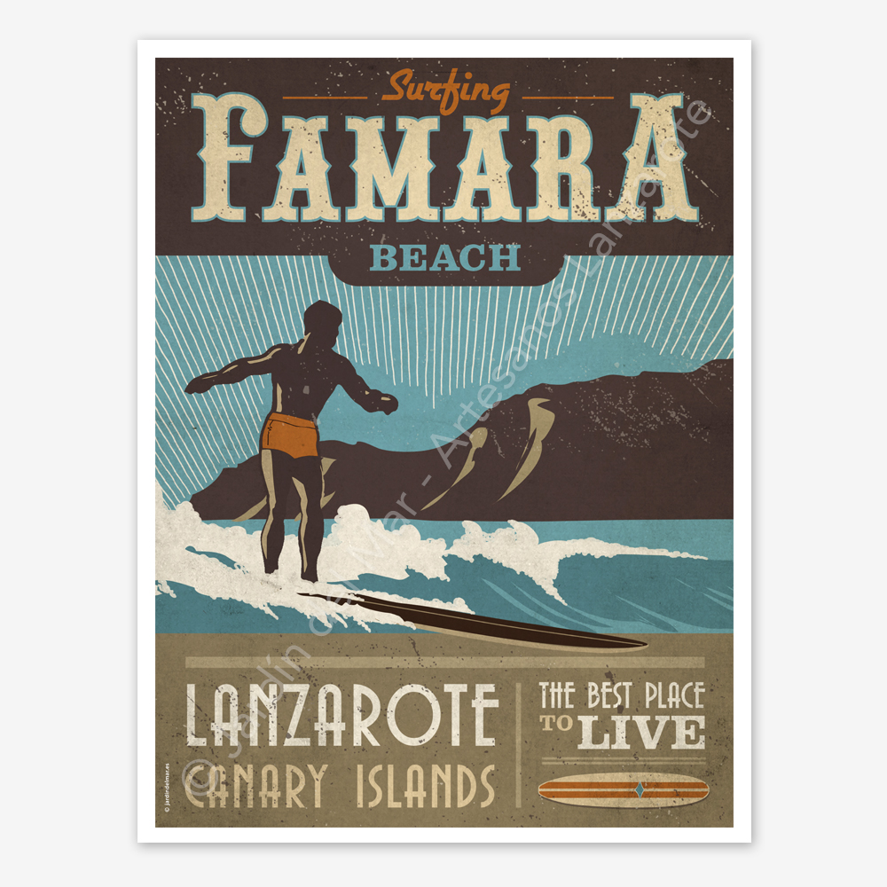 La Playa de Famara protagoniza con su risco y sus olas perfectas, en una escena dinámica y nostálgica de Mad Mac, inspirada en los clásicos Vintage Travel Posters.