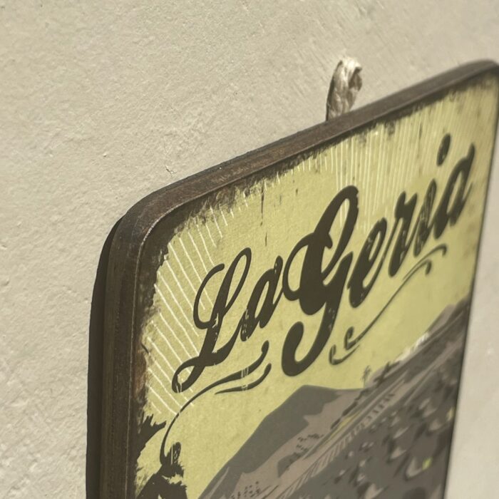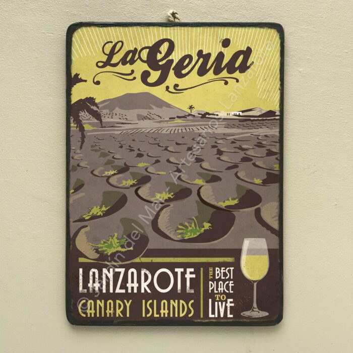 Una placa de madera de estilo vintage habla de uno de los paisajes más asombrosos de Lanzarote: La Geria.