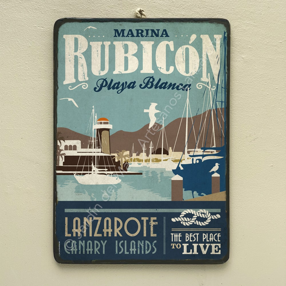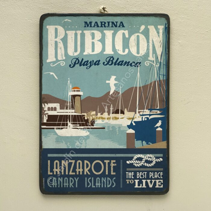 Placa de madera hecha a mano que representa Marina Rubicón, el característico puerto deportivo de Lanzarote, en el sur de la isla.